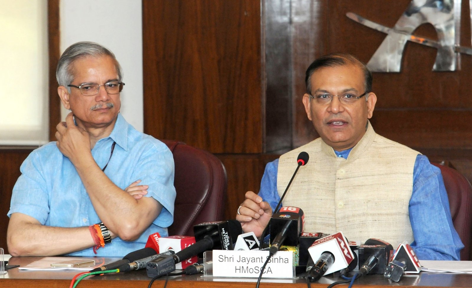 New Delhi: Union MoS Civil Aviation Jayant Sinha briefs the media on the proposed Passenger Charter and aspects of Air Sewa, in New Delhi on May 22, 2018. Also seen Ministry of Civil Aviation Secretary R.N. Choubey. (Photo: IANS/PIB)