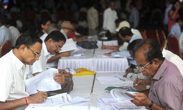People file Income Tax Returns on the penultimate day of filing IT Returns at Income Tax mela organised at Palace Grounds in Bangalore on July 30, 2014. (Photo: IANS)