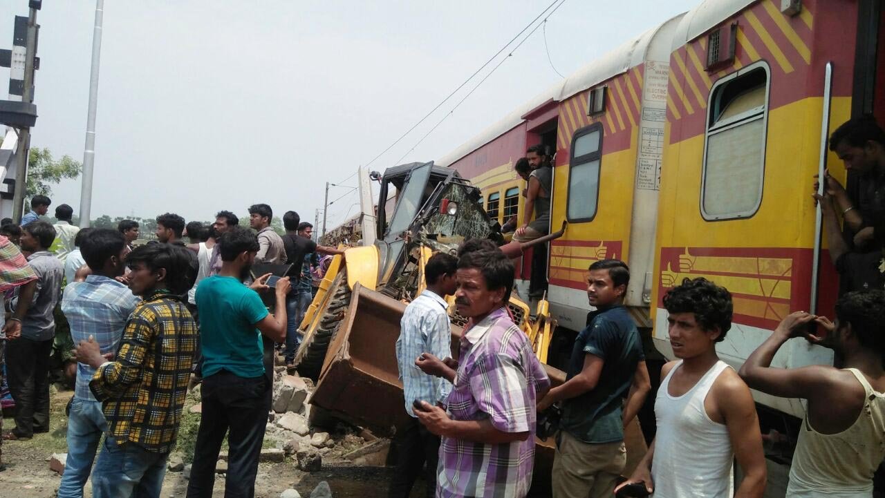 JCB travelling on Mandia and Jaraka Road got stuck on the level crossing and the driver tried to make it out of level crossing, but failed. By that time, the Train came nearer.