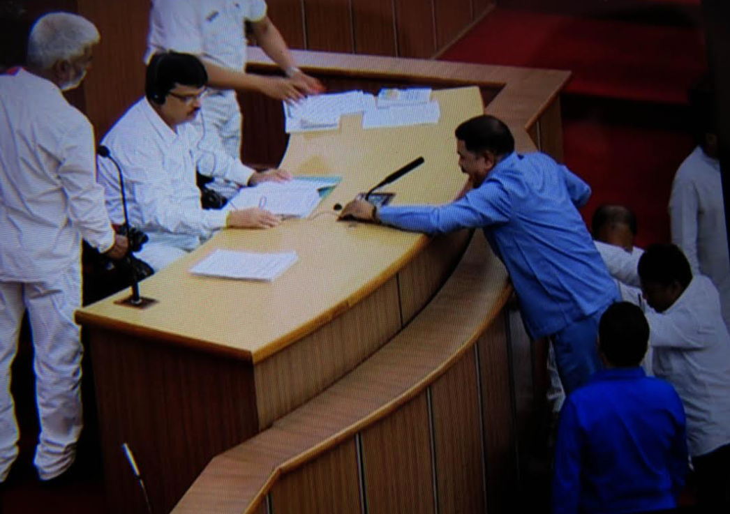 It so happened that as soon as the House assembled for the day, the Congress leaders barged into the well of the State Assembly and shouted slogans demanding hike in MSP of paddy. Congress chief whip Tara Prasad Bahinipati was stopped by the Assembly staff while attempting to climb atop the Speaker’s table. Due to this fiasco made by the Congress, Minister Usha Devi’s statements during the Question Hour was not audible clearly.
