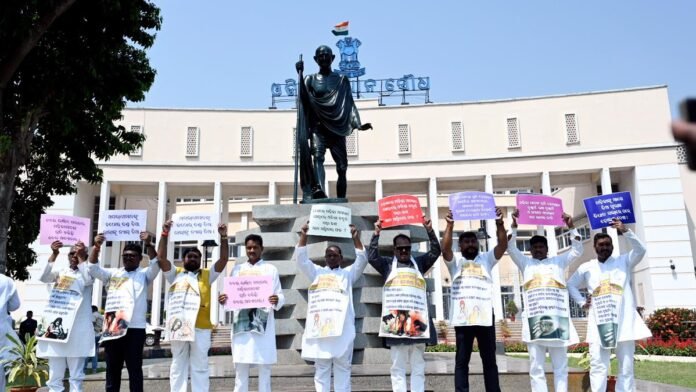 After the House was adjourned, the BJD members held a sit-in near Biju Patnaik’s statue while the Congress members staged a peaceful demonstration near the Mahatma Gandhi statue on the assembly premises.