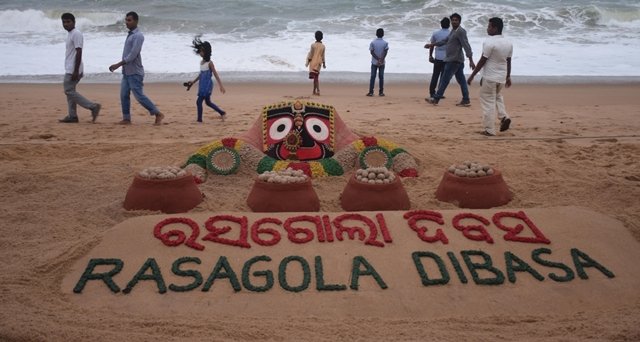 Puri: Sand artist Sudarshan Patanaik creates a sand art on Rasagola, a desert at Puri sea beach in Odisha on July 16, 2016. Odisha and West Bengal are fighting for the GI tag and paten over Rasagola. (Photo: IANS)