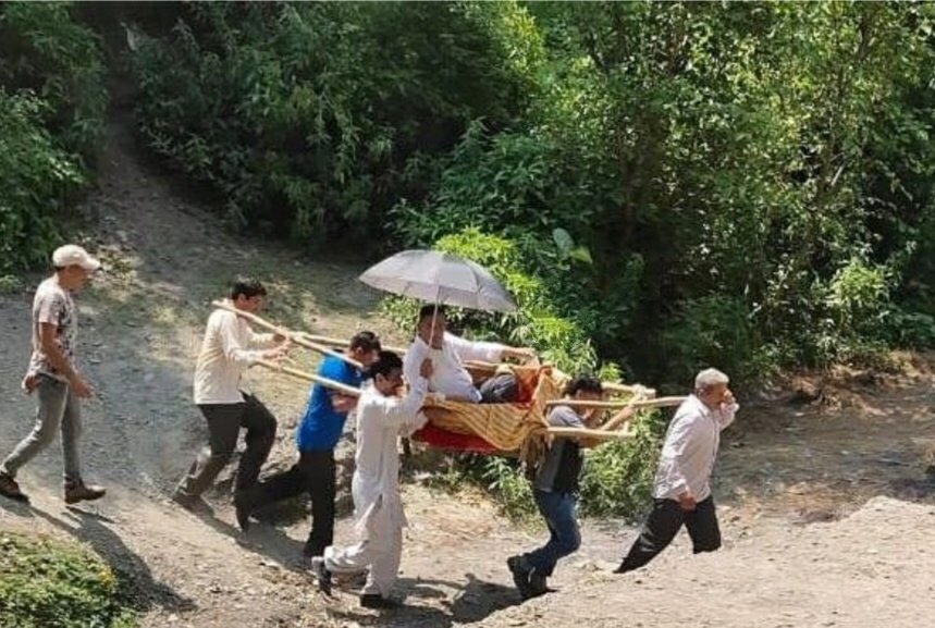The picture showing Showkat Ajaz Bhat being carried in a palanquin by people with an attendant holding an umbrella over his head has gone viral on Wednesday to the embarrassment of the state administration.