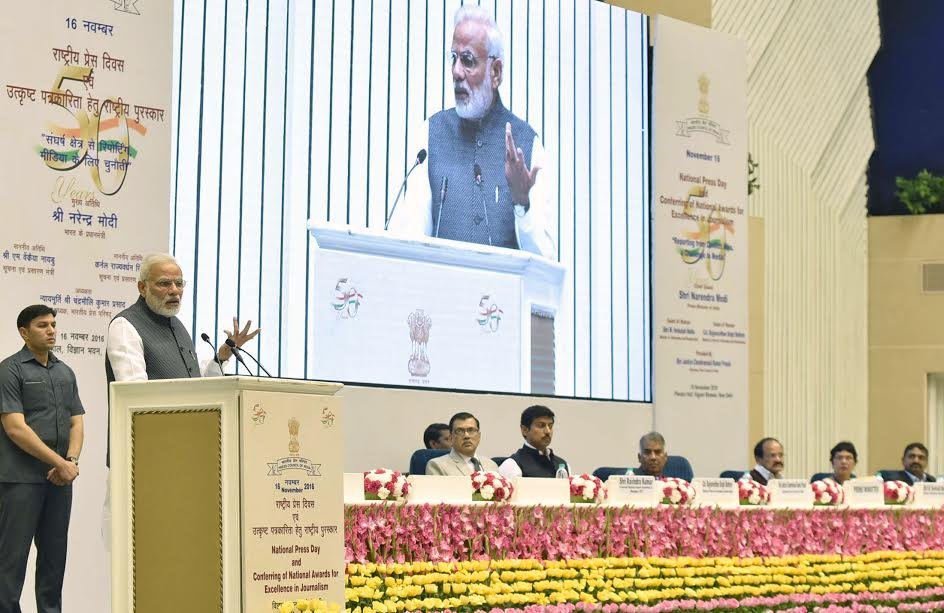 The Prime Minister, Shri Narendra Modi addressing at the Golden Jubilee celebrations of the Press Council of India on the National Press Day, in New Delhi on November 16, 2016.