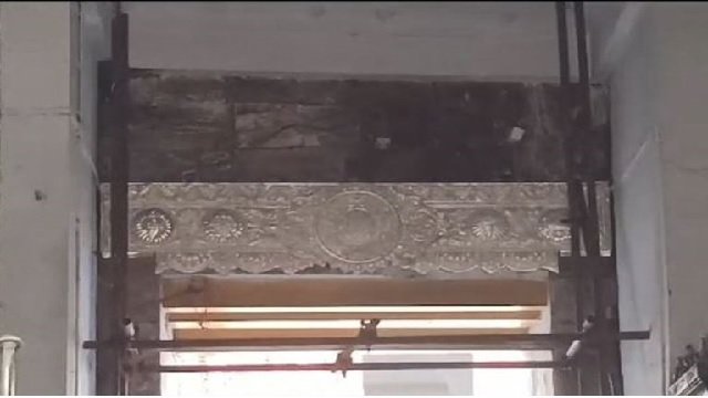 Puri: The Silver plating work of Singha Dwara’s ‘Gumuta’ has begun at the famous Lord Jagannath temple, the Srimandira in Puri of Odisha on Sunday. As per reports, the silver plating is being applied to the ‘Gumuta’ of the Singha Dwara of the temple. The silver repair work looks attractive with fine craftsmanship.