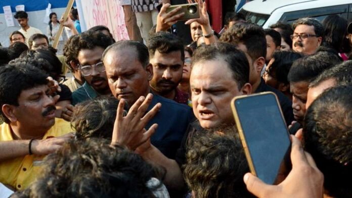 The ruling Trinamool Congress’s Shiksha Cell office on the campus, which was set ablaze by angry protesters after the minister’s convoy left the university, bore telltale signs of rampage as gutted festoons, chairs and other articles were seen lying in a heap outside the room.